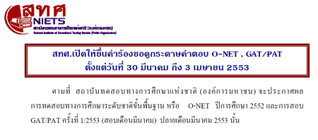 สถาบันทดสอบทางการศึกษาแห่งชาติ (องค์การมหาชน) จะประกาศผลการทดสอบทางการศึกษา ระดับชาติขั้นพื้นฐาน หรือ O-NET ปีการศึกษา 2552 และการสอบ GAT/PAT ครั้งที่ 1/2553 (สอบเดือนมีนาคม) ปลายเดือนมีนาคม 2553 อ่านรายละเอียดการเปิดให้ยื่นคำร้องดูกระดาษคำตอบ ได้ที่นี่ค่ะ ขอขอบคุณข้อมูลและภาพประกอบจาก