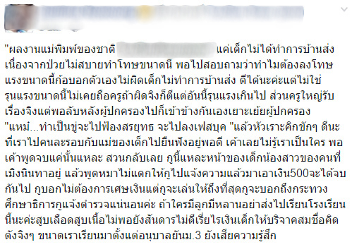"ผลงานแม่พิมพ์ของชาติ โรงเรียน XX" แค่เด็กไม่ได้ทำการบ้านส่งเนื่องจากป่วยไม่สบายทำโทษขนาดนี้ พอไปสอบถามว่าทำไมต้องลงโทษแรงขนาดนี้ก็บอกตัวเองไม่ผิดเด็กไม่ทำการบ้านส่ง ตีได้นะคะแต่ไม่ใช่รุนแรงขนาดนี้ไม่เคยถือครูถ้าผิดจริงก็ตีแต่อันนี้รุนแรงเกินไป ส่วนครูใหญ่รับเรื่องจริงแต่พอลับหลังผู้ปกครองไปก็เข้าข้างกันเองเยาะเย้ยผู้ปกครอง "แหม๋...ทำเป็นขู่จะไปฟ้องสรยุทธ จะไปลงเฟซบุ๊ก" แล้วหัวเราะคิกคัก ๆ ดีนะที่เราไปคนละรอบกับแม่ของเด็กไปยืนฟังอยู่พอดี เค้าเลยไม่รู้เราเป็นใคร พอเค้าพูดจบแค่นั้นแหละ สวนกลับเลย กูนี่แหละน้าของเด็กน้องสาวของคนที่เมิงนินทาอยู่ แล้วพูดหมาไม่แดกให้กูไปแจ้งความแล้วมาเอาเงิน 500 จะได้จบกันไป กูบอกไม่ต้องการเศษเงินแต่กูจะเล่นให้ถึงที่สุดกูจะบอกถึงกระทรวงศึกษาธิการกูแจ้งตำรวจแน่นอนค่ะ ถ้าใครมีลูกมีหลานอย่าส่งไปเรียนโรงเรียนนี้นะคะสูบเลือดสูบเนื้อไม่พอยังสันดานไม่ดีเรี่ยไรเงินเด็กให้บริจาคสมชื่อคิดตังค์จริง ๆ ขนาดเราเรียนมาตั้งแต่อนุบาลยัน ม.3 ยังเสียความรู้สึก