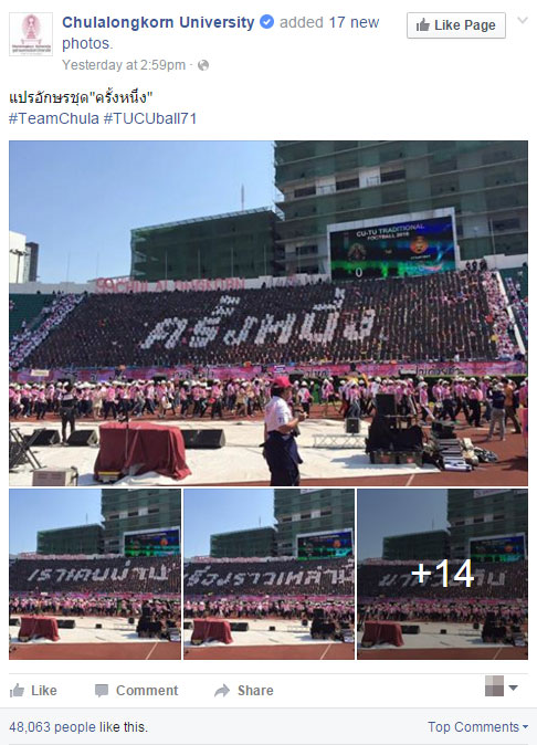 เป็นประเด็นร้อนอีกแล้ว สำหรับเรื่องราวจากงานฟุตบอลประเพณีธรรมศาสตร์-จุฬาฯ ครั้งที่ 71 ที่เพิ่งจัดขึ้นเมื่อเย็นวันที่ 13 กุมภาพันธ์ 2559 และจบลงไปอย่างสวยงาม และล่าสุด เฟซบุ๊กเพจ จุฬาลงกรณ์มหาวิทยาลัย รวบรวมการแปรอักษรชุด “ครั้งหนึ่ง” มาให้ชาวเน็ตได้ชมกัน