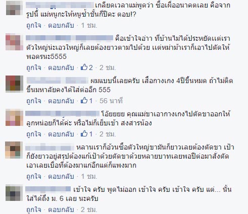 ขณะที่บางคนมองว่าบางทีแม่เด็กอาจจะไม่ได้ตั้งใจซื้อเผื่อโตก็เป็นได้ แต่บังเอิญว่าน้องตัวแอบใหญ่ไปนิด เลยมีแต่ไซส์ผู้ใหญ่ ทำให้ขาอาจจะดูยาวไปหน่อย แต่ก็ยังดูแล้วน่ารักน่าเอ็นดูอยู่ดี อย่างไรก็ตามอาจจะดีกว่านี้ถ้าคุณแม่จะพาไปตัดขากางเกงออกสักนิด เพราะดู ๆ ไปแล้วเหมือนน้องใส่กางเกงขายาวอยู่เลยนะนั่น