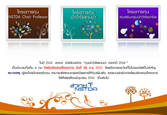 สำนักงานพัฒนาวิทยาศาสตร์และเทคโนโลยีแห่งชาติ (nstda) เปิดรับสมัคร "ทุนนักวิจัยแกนนำ ประจำปี 2553" จำนวน 2 ทุน ทุนละไม่เกิน 20 ล้านบาท โดยจะเปิดรับข้อเสนอโครงการ ตั้งแต่บัดนี้จนถึงวันที่ 30 กันยายน 2553