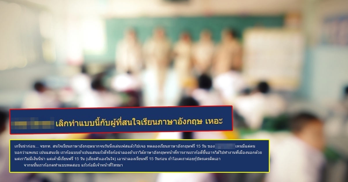 สาวแชร์ประสบการณ์ถูกสถาบันสอนภาษาชื่อดังหลอกขายคอร์สเรียนภาษาอังกฤษในหลักแสน หลังตั้งใจไปเรียนฟรี 15 วันตามที่โฆษณา แถมถูกยัดเยียดให้กู้เงิน อยากเตือนไว้เป็นอุทาหรณ์ วอนขอให้เลิกทำแบบนี้กับผู้ที่สนใจเรียน