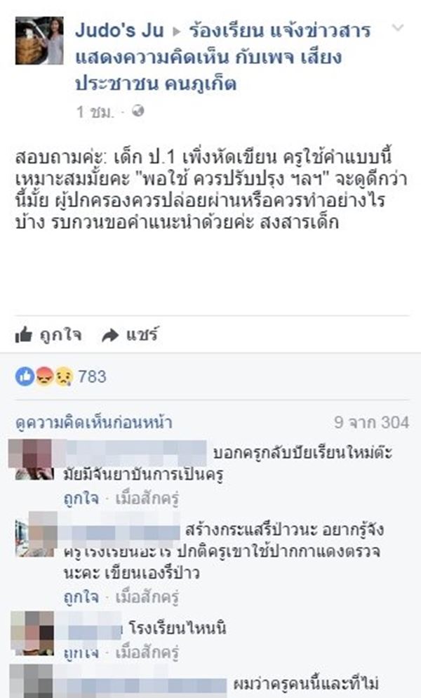 วันที่ 30 พฤษภาคม 2560 บนโลกออนไลน์ต่างแห่วิพากษ์วิจารณ์การกระทำของครูที่ตรวจการบ้านเด็ก แล้วใช้คำที่ไม่เหมาะสม หลังผู้ใช้เฟซบุ๊กชื่อ Judo\'s Ju ได้โพสต์ภาพพร้อมกับข้อความลงบนกลุ่มเฟซบุ๊ก ร้องเรียน แจ้งข่าวสาร แสดงความคิดเห็น กับกลุ่มเฟซบุ๊ก เสียงประชาชน คนภูเก็ต โดยระบุว่า "สอบถามค่ะ เด็ก ป.1 เพิ่งหัดเขียน ครูใช้คำแบบนี้เหมาะสมไหมคะ พอใช้ ควรปรับปรุง ฯลฯ จะดูดีกว่านี้ไหม ผู้ปกครองควรปล่อยผ่านหรือควรทำอย่างไรบ้าง รบกวนขอคำแนะนำด้วยค่ะ สงสารเด็ก"