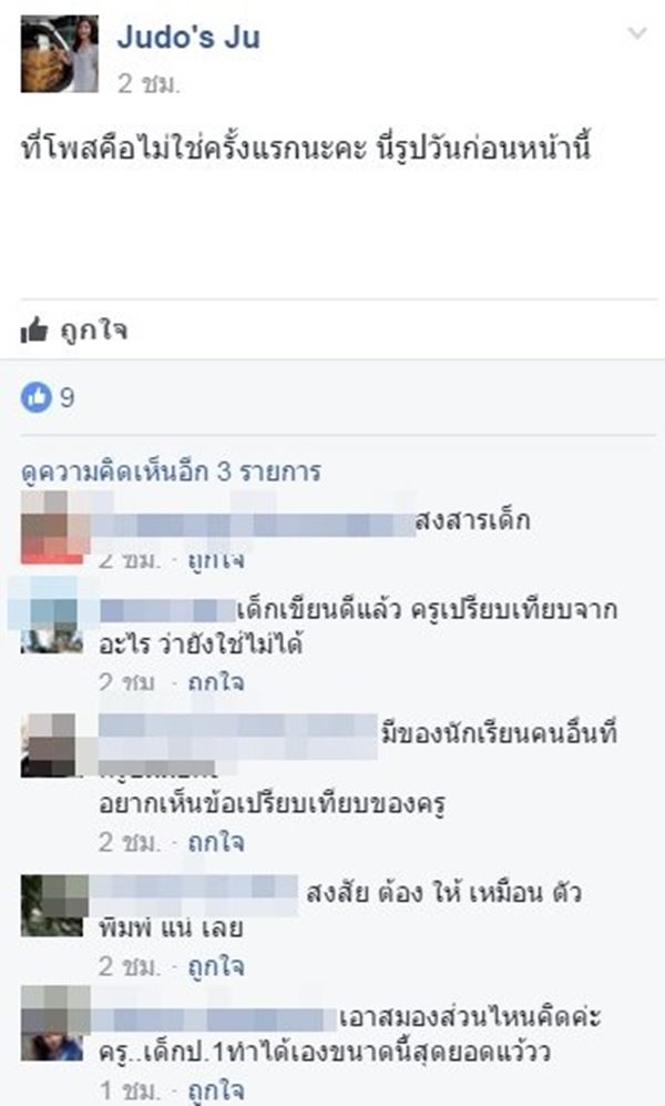 ทั้งนี้ เรื่องดังกล่าวทำให้มีผู้เข้ามาแสดงความคิดเห็นกันเป็นจำนวนมาก โดยบอกว่า น่าจะเป็นครูมากกว่าที่ไม่ได้เรื่อง ใช้คำไม่เหมาะสม ทำร้ายจิตใจเด็กอย่างยิ่ง ทั้ง ๆ ที่ลายมือของเด็กนั้นเป็นตัวบรรจงที่สวยงามกว่าเด็กปกติ ใช้หลักเกณฑ์อะไรมาตัดสินว่ายังใช้ไม่ได้ เด็ก ป.1 เขียนได้ขนาดนี้ถือว่าสุดยอดมากแล้ว