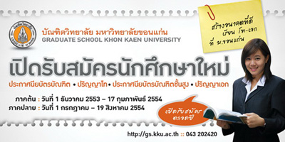 บัณฑิตวิทยาลัย มหาวิทยาลัยขอนแก่น เปิดรับสมัครสอบคัดเลือกเข้าศึกษาในระดับบัณฑิตศึกษา ประจำภาคการศึกษาต้น ปีการศึกษา 2554