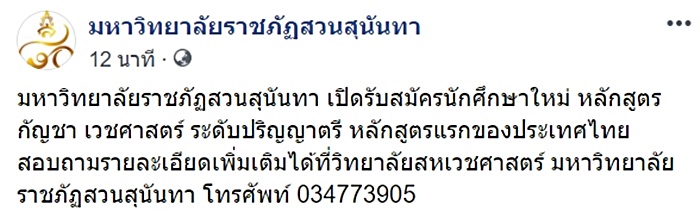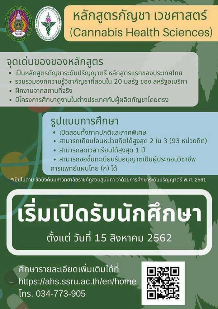วันที่ 13 สิงหาคม 2562 เฟซบุ๊ก มหาวิทยาลัยราชภัฏสวนสุนันทา ได้ออกประกาศ เปิดรับสมัครนักศึกษาใหม่ หลักสูตรกัญชา เวชศาสตร์