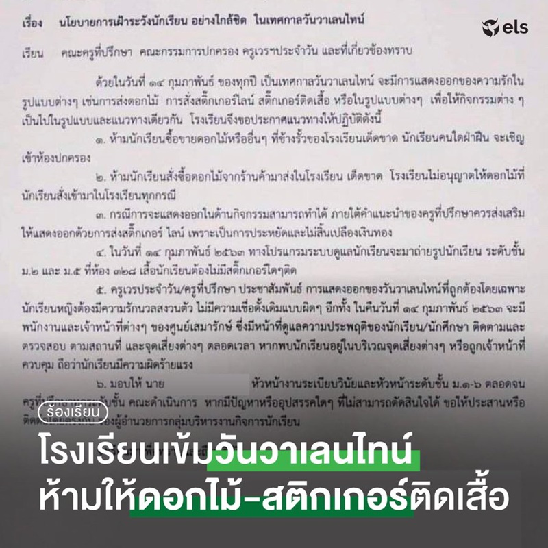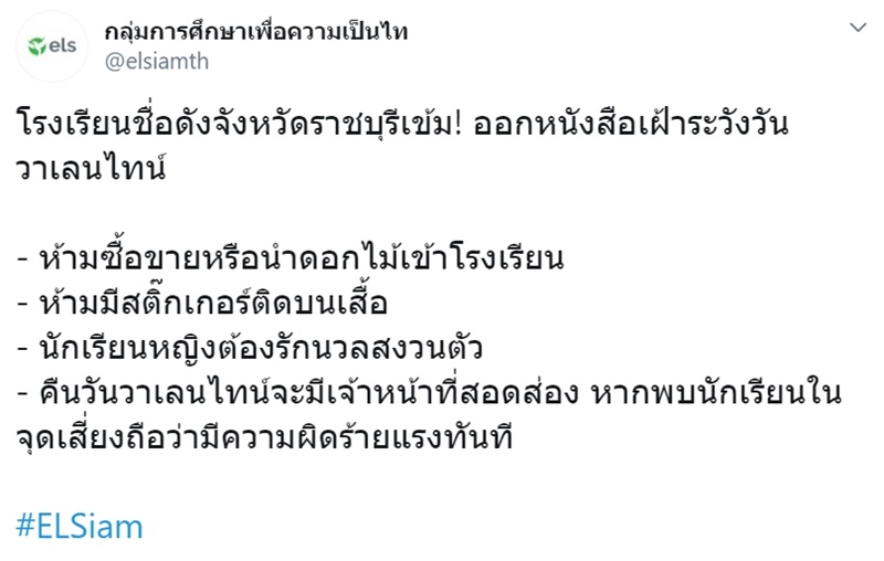 โรงเรียนดังราชบุรี ออกนโยบายเฝ้าระวังวันวาเลนไทน์ สั่งห้ามซื้อดอกไม้มาโรงเรียน ห้ามติดสติ๊กเกอร์บนเสื้อผ้า นักเรียนต้องรักนวลสงวนตัว ใครฝ่าฝืนจะเชิญเข้าห้องปกครอง