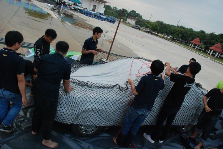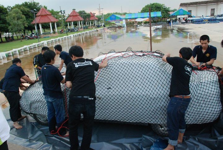มทส. คิดวิธีห่อรถด้วยตาข่ายและผ้าใบ ลอยน้ำหนีน้ำท่วม แก้ปัญหารถจมน้ำและไม่มีที่จอดรถ