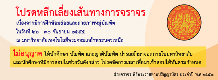 มหาวิทยาลัยเทคโนโลยีพระจอมเกล้าพระนครเหนือ จึงประกาศให้ทราบและโปรดหลีกเลี่ยงเส้นทางการจราจร ในบริเวณดังกล่าว