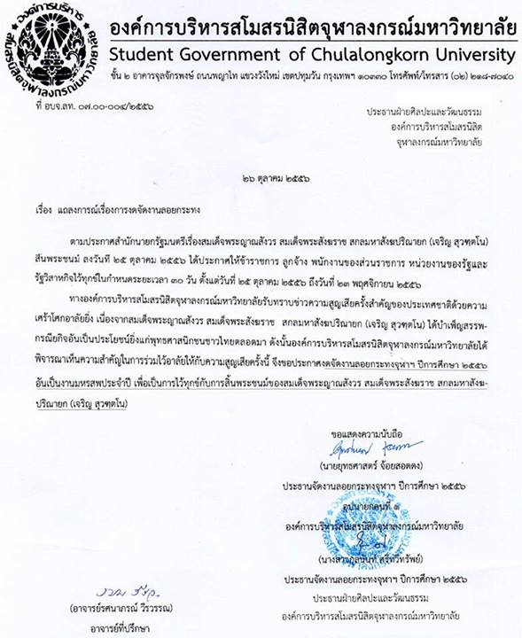 ทางองค์การบริหารสโมสรนิสิตจุฬาลงกรณ์มหาวิทยาลัย รับทราบข่าวความสูญเสียครั้งสำคัญของประเทศชาติด้วยความเศร้าโศกอาลัยยิ่ง เนื่องจากสมเด็จพระญาณสังวร สมเด็จพระสังฆราช สกลมหาสังฆปริณายก (เจริญ สุวฑฺตโน) ได้บำเพ็ญสรรพกรณียกิจอันเป็นประโยชน์ยิ่งแก่พุทธศาสนิกชนชาวไทยมาตลอดเวลา ดังนั้น องค์การบริหารสโมสรนิสิจุฬาลงกรณ์มหาวิทยาลัยได้พิจารณาเห็นความสำคัญในการร่วมไว้อาลัยให้กับการสูญเสียในครั้งนี้ จึงขอประกาศงดจัดงานลอยกระทงจุฬาฯ ปีการศึกษา 2556 อันเป็นงานมหรสพประจำปี เพื่อเป็นการไว้ทุกข์กับการสิ้นพระชนม์ของสมเด็จพระญาณสังวร สมเด็จพระสังฆราช สกลมหาสังฆปริณายก (เจริญ สุวฑฺตโน)