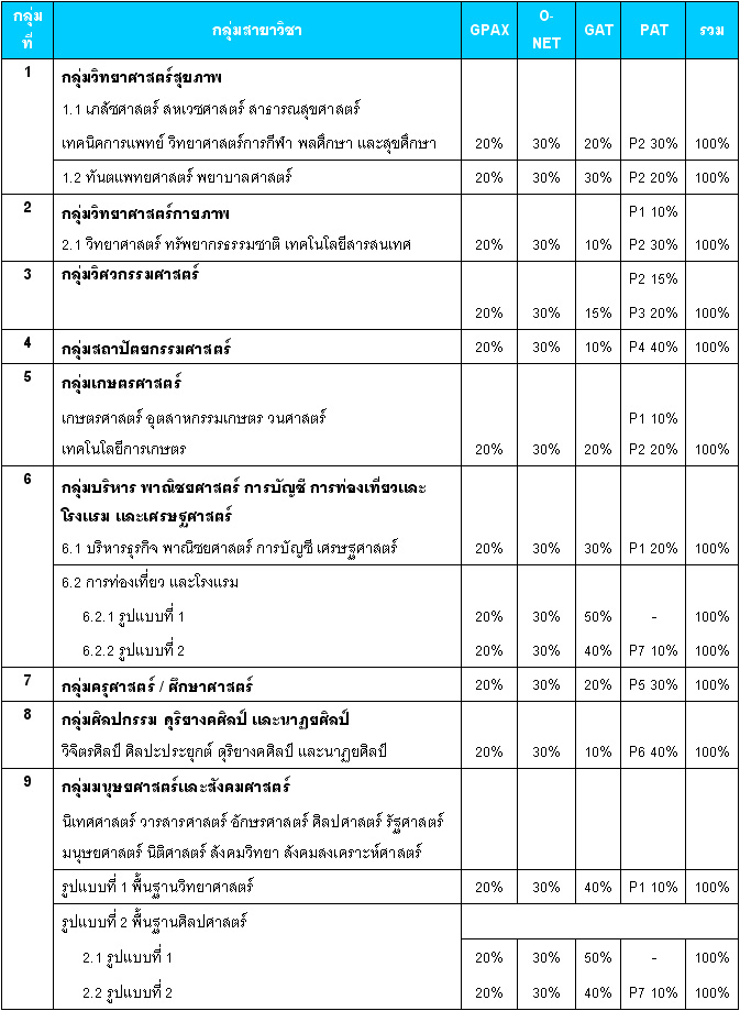 สรุปองค์ประกอบและค่าน้ำหนักในการคัดเลือกบุคคลเข้าศึกษาต่อในสถาบันอุดมศึกษา (Admissions) ปีการศึกษา 2553